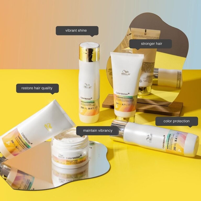Le shampoing "ColorMotion+" de Wella Professionals, est un shampoing de dédié aux cheveux colorés qui permet d’aller au-delà de l’anti-affadissement offrant jusqu’à 8 semaines de protection de la couleur*. L’utilisation régulière de la routine de soins ColorMotion+ améliore trois aspects de la qualité des cheveux colorés qui leur sont particulièrement importants : la protection de la couleur, la brillance de l’éclat, la résistance des cheveux**.